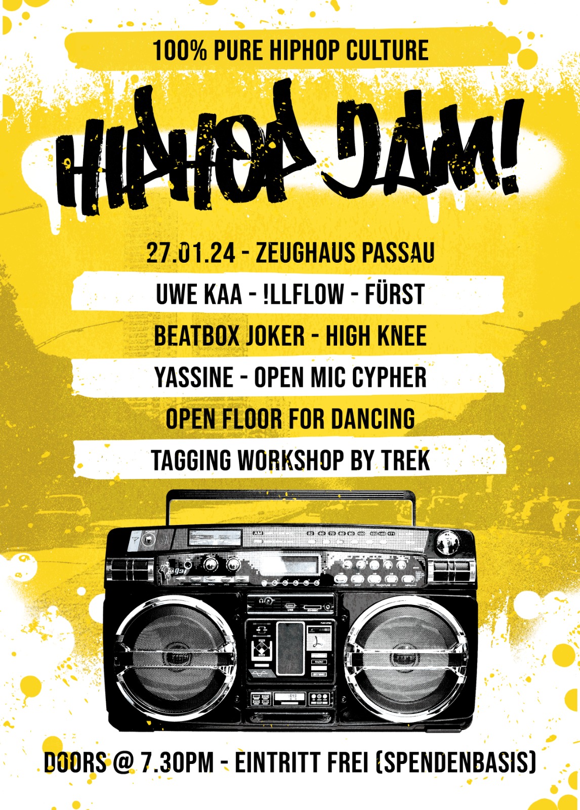 Eintritt frei auf Spendenbasis - komm vorbei und feier HipHop Kultur in Reinstform mit uns