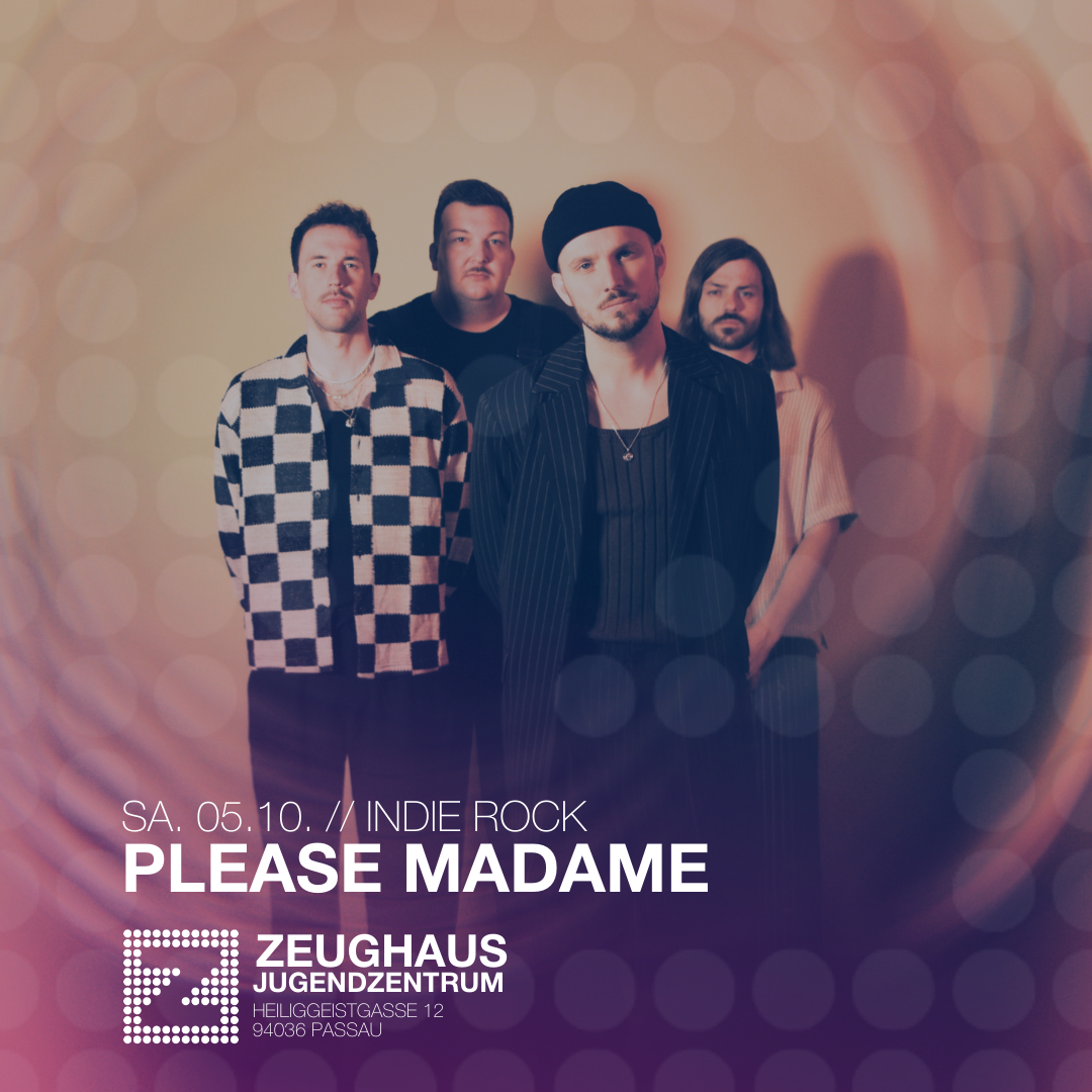 Nach den Erfolgen ihrer ersten Alben, unzähligen Live-Auftritten, darunter in der Pro7-TV-Show Circus Halligalli oder auf den größten Festivalbühnen Österreichs (u.a. FM4 Frequency Festival, Nova Rock), eigenen Tourneen und Supportshows für zB. Foals, Hurts, Provinz sowie Madsen, haben sich Please Madame mittlerweile fest in den deutschsprachigen Musikkalender gespielt. Das im September 2021 erschienene Album „Angry Boys, Angry Girls“ des Salzburger Indie-Rock-Quartetts landete prompt für zwei Wochen auf Platz 25 der österreichischen Album-Charts und wurde allein in den letzten zwei Jahren bei knapp 80 Konzerten auf die Bühne gebracht.